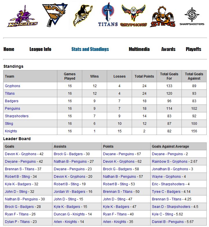 - Individually tracks player stats, including: photo, games played, goals, assists, points, goals against, goals against average